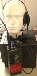 This was the standard Hand-held radio of the British army, part of the "Clansman" series of "RACAL" radio equipment. This set has been tested and is bang on spec and frequency. The PRC-349 is a VHF/FM radio with a frequency range is 37 to 46.975 MHz in 25 KHz steps providing 400 possible channels and a maximum output power of 1 Watt. Frequency selection is by small thumb wheel switches on the side of the radio. Has Clansman compatible squelch and whisper modes of operation with battery saving function. Operates from 9.5 to 16v DC using AA batteries or rechargable NiCad battery. It comes with the standard headset with a throat mic and mini pressel switch, battery pack, 0.65m rubber base loaded whip antenna, all used, working and servicable. Intended for platoon level personal communications under combat conditions. Protection from open or short circuit and receiver overload is inbuilt. A battery saver function is in automatic operation during no-signal conditions. All funds must have cleared before posting or collection. |